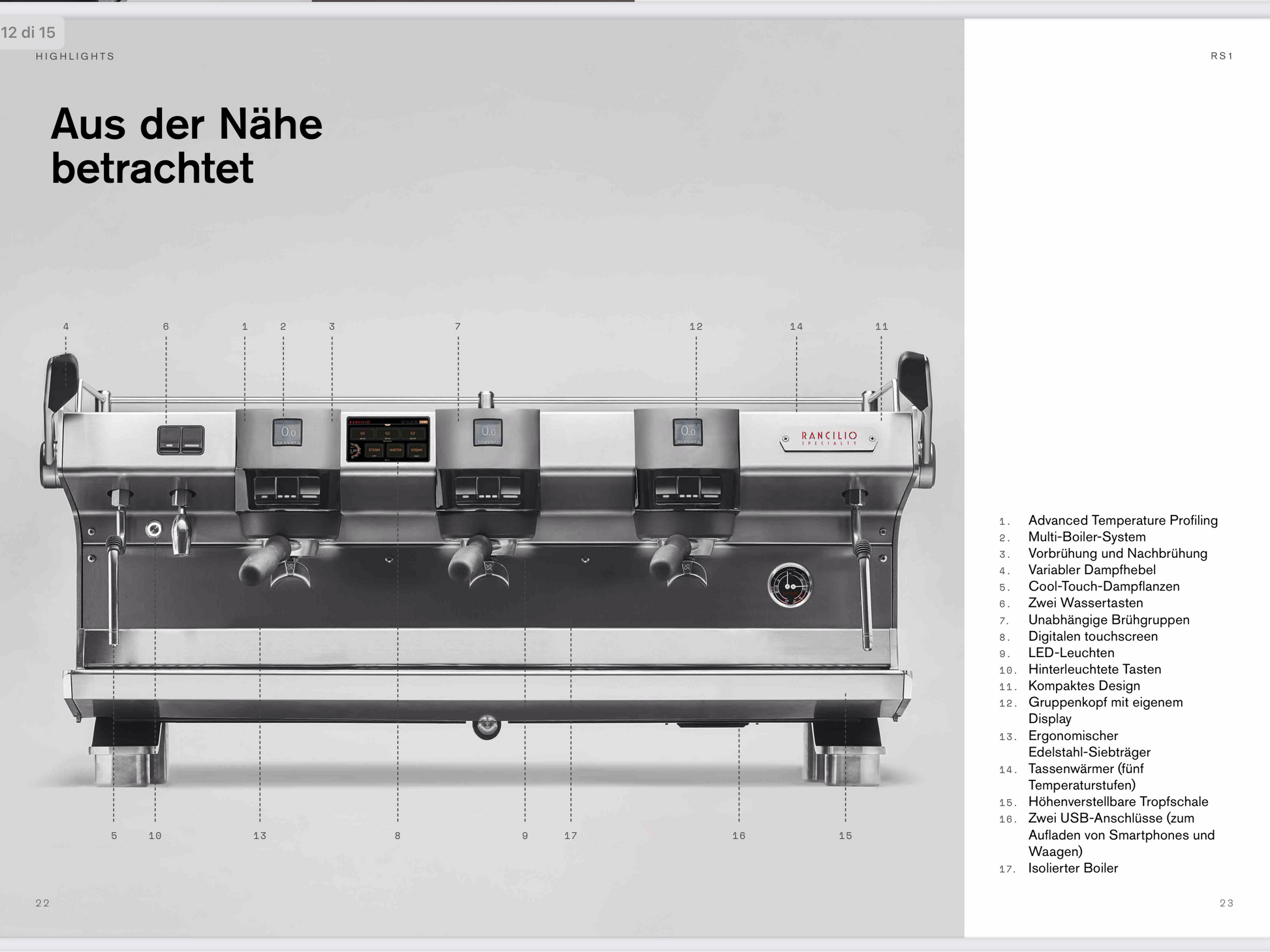 Die RS1 hilft Kaffeeprofis, ein besseres Kaffeeerlebnis zu bieten. In Kombination mit dem ausgezeichneten Fachwissen von Rancilio und einem einzigartigen Workflow-Design bietet die RS1 modernste Brühtechnologie. Das Ergebnis: eine einfach zu bedienende Espressomaschine zum fairen Preis.